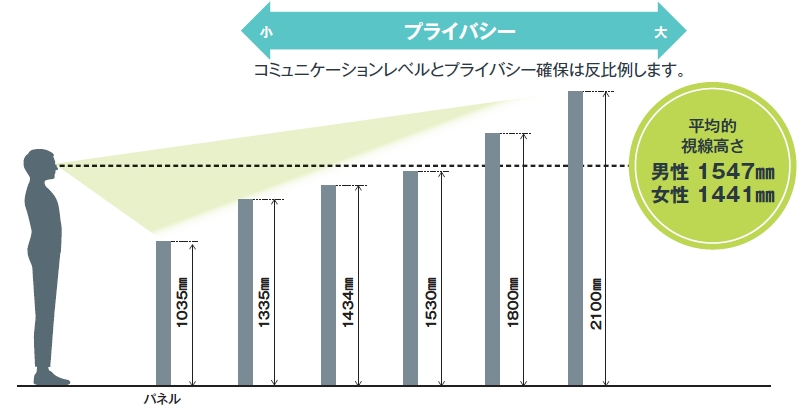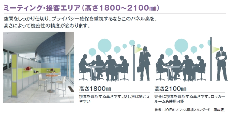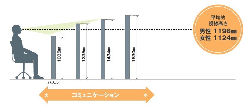 空間をしっかり仕切り、プライバシー確保を重視するならこのパネル高を採用します。高さによって機密性の精度が変わります。