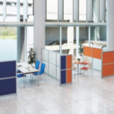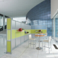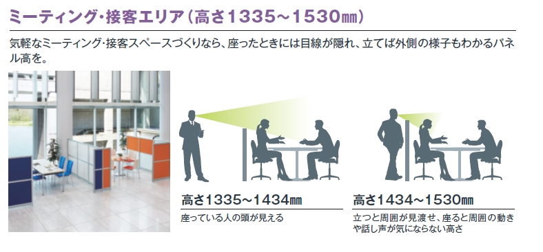 気軽なミーティング・接客スペースづくりなら、座ったときには目線が隠れ、立てば外側の様子もわかるパネル高を採用します。