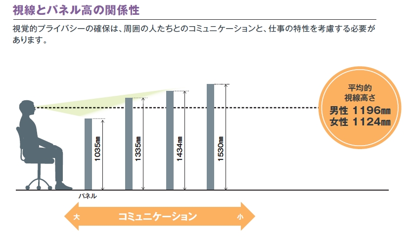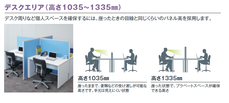 デスク周りなど個人スペースを確保するには、座ったときの目線と同じくらいのパネル高を採用します。