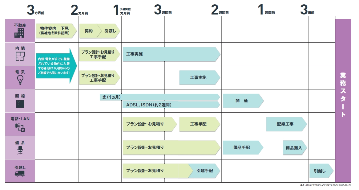 事務所の移転となると約半年前から準備期間を設けることも多いですが、プロジェクト案件に伴う臨時事務所の開設は、よりスピーディに行う必要があります。ここでは最短2ヵ月~3ヵ月で開設するスケジュールをご紹介します。