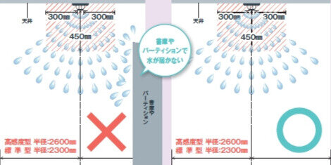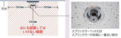 スプリンクラーヘッドから垂直方向に450mm、水平方向に300mm以内に物を置いてはいけません。