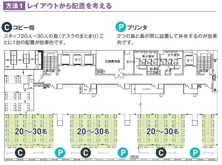スタッフ20人~30人の島(デスクのまとまり)ごとに1台の配置が効果的です。