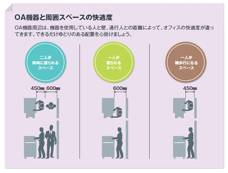 OA機器周辺は、機器を使用している人と壁、通行人との距離によって、オフィスの快適度が違ってきます。できるだけゆとりのある配置を心がけましょう。