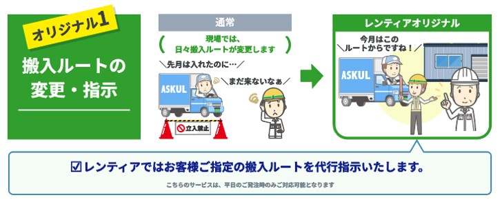 「特別な搬入経路がある」「納品を禁止されている時間帯がある」等の場合は、こちらのサービスをご利用ください。お客様に代わり、注文の都度、コーユーレンティアよりアスクルに代行指示いたします。