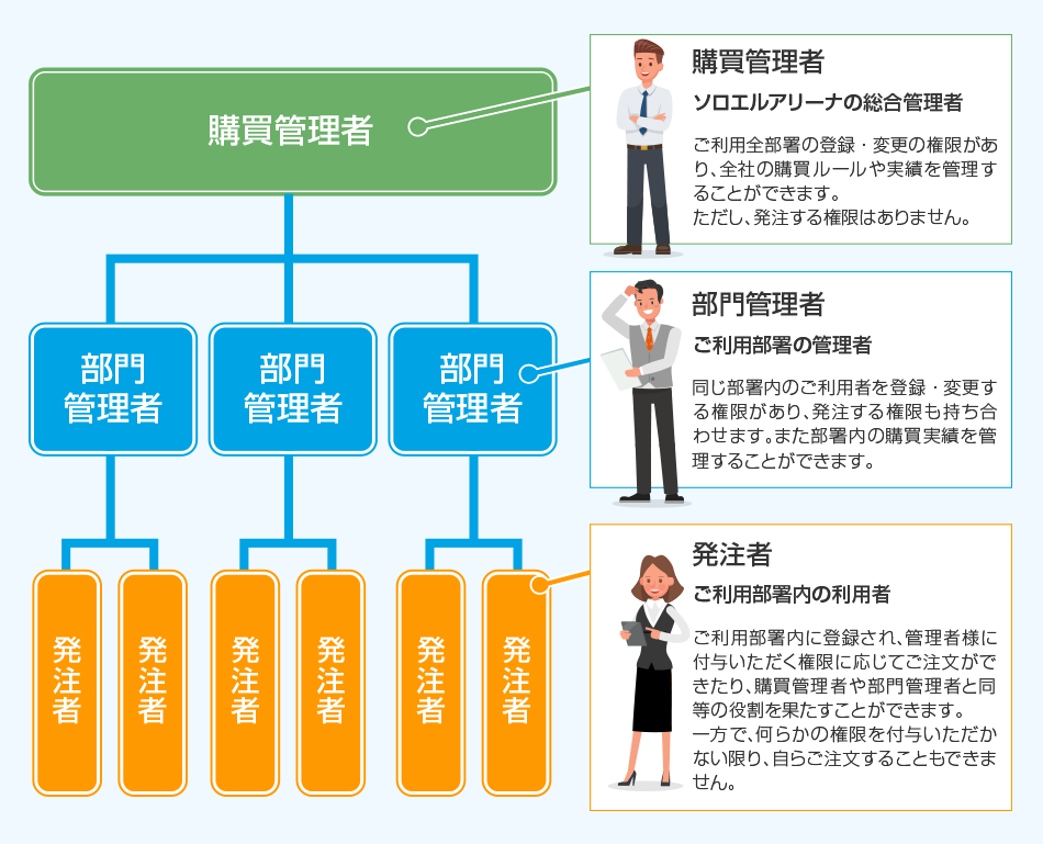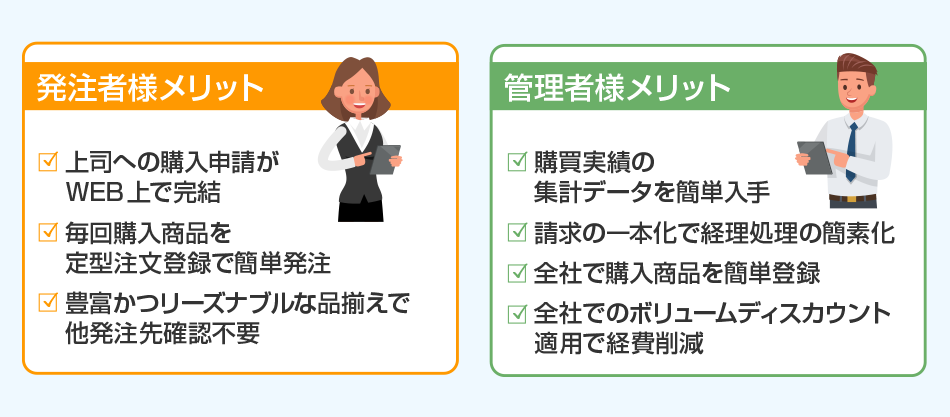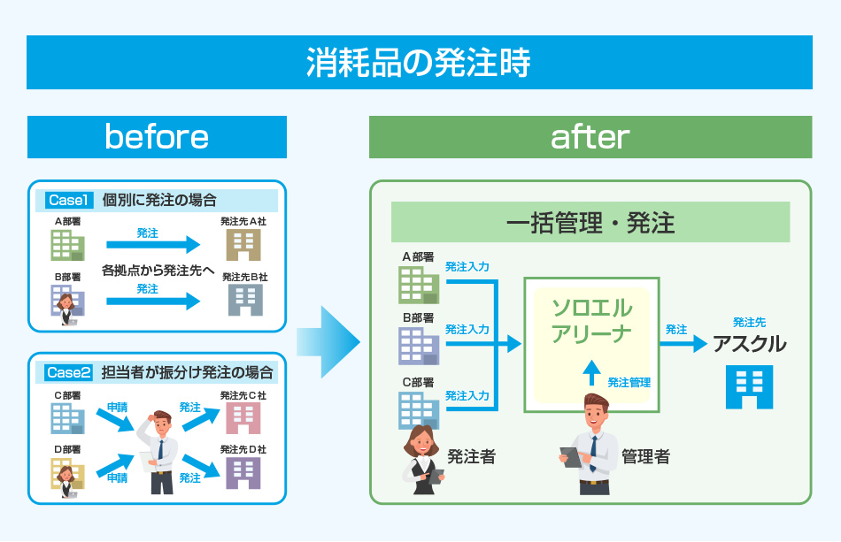 各部署個別の購買をソロエルアリーナサイト上で集約することにより、購買プロセスを可視化し、発注者様・管理者様の購買業務にかかる時間と手間を削減します。