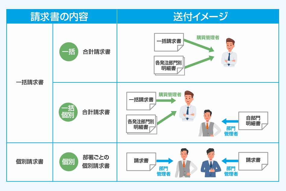 ・「一括」「一括個別」「個別」の3種類の請求書発行形態が選択できます。