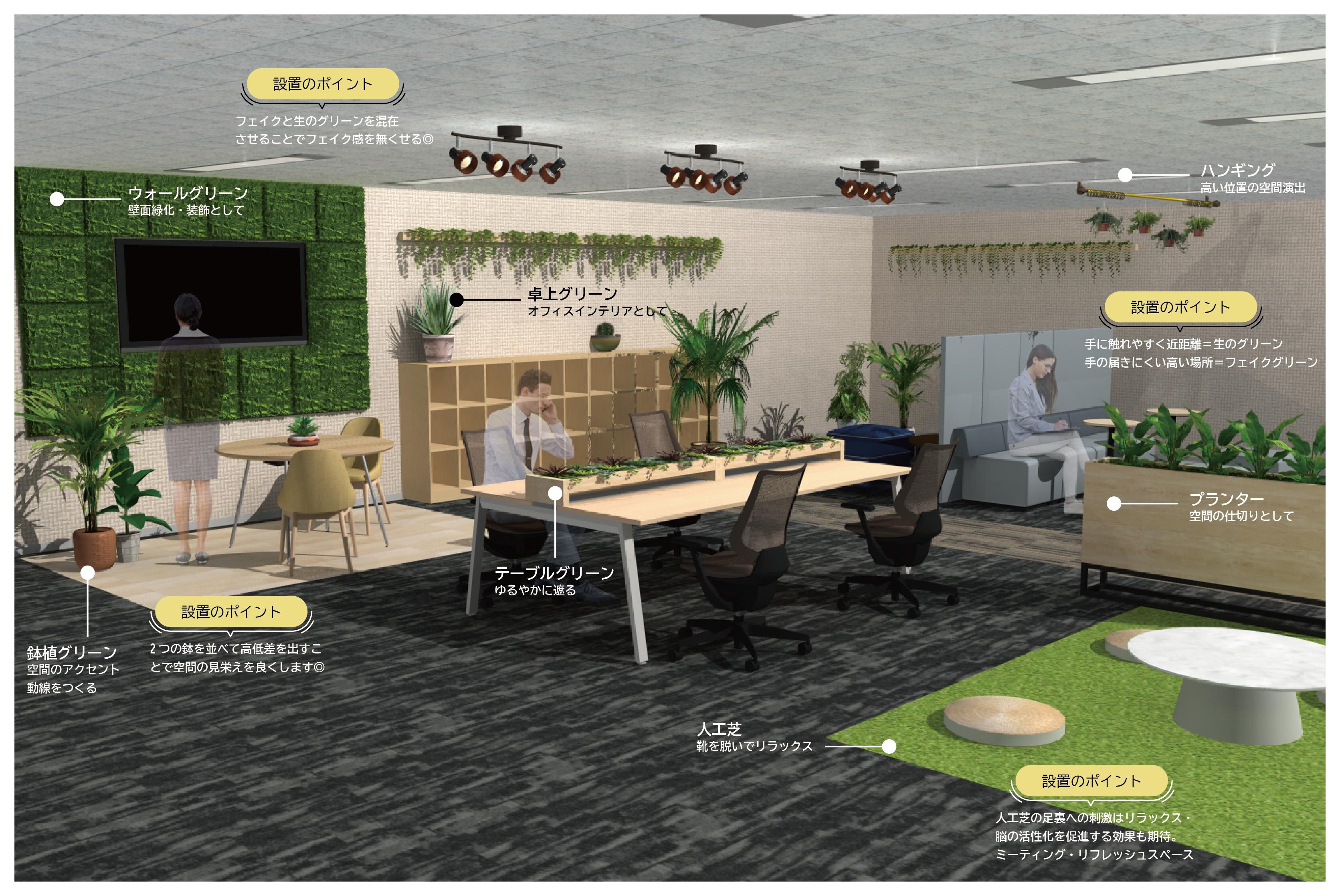 空間をオシャレにすることだけでなく、様々な用途として活躍するオフィスグリーン。ワークシーンに合わせてコーディネートします。