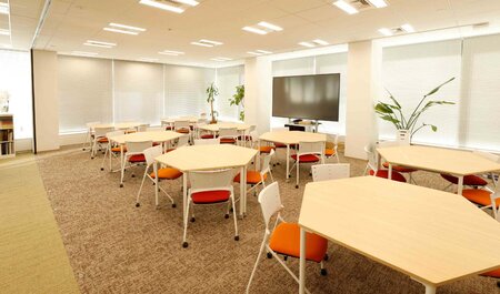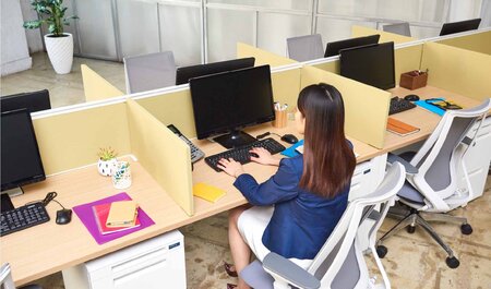 キャスター付きの可動式デスクは人数や業務内容に合わせてフレキシブルにレイアウト変更ができます。個人やチーム作業にも適しており、コミュニケーションが取りやすく、作業効率UPが期待できます。
