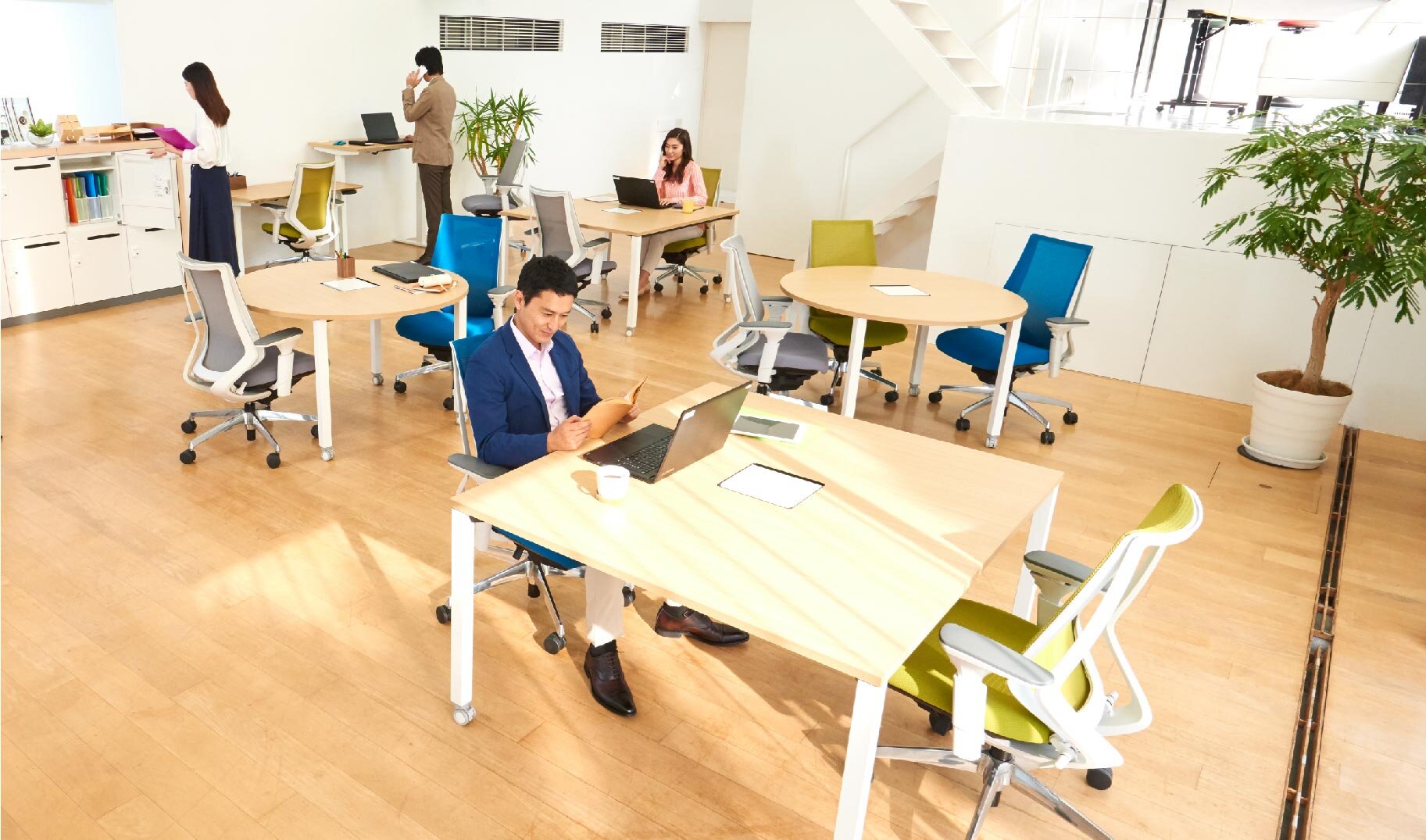 座ることと立つことを交互に繰り返せば、疲労軽減やリフレッシュ効果が期待できます。普段は腰を据えてじっくりと、動き回る人や視点を変えたいときにはスタンディングスタイルと、心地よい仕事のリズムが生まれます。