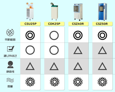 ・冷風機の場合、空気を効率的に循環させるために、広い空間でも均一的に冷却することが