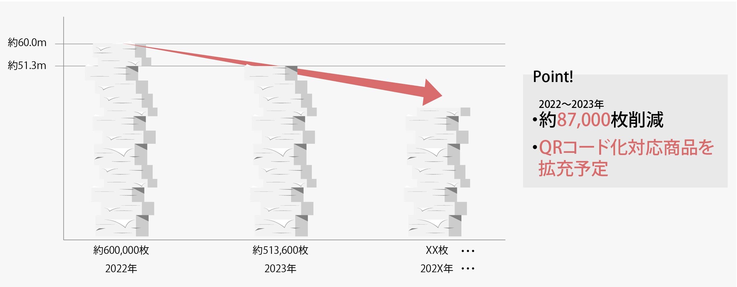 説明書をどこに置いたか探すことなく、スマホ一つで簡単にたどり着くことができる。QRコード化を導入した結果、2023年の1年間に削減できた紙の枚数は約600,000枚から約513,000枚で約87,000枚削減することが出来ました。