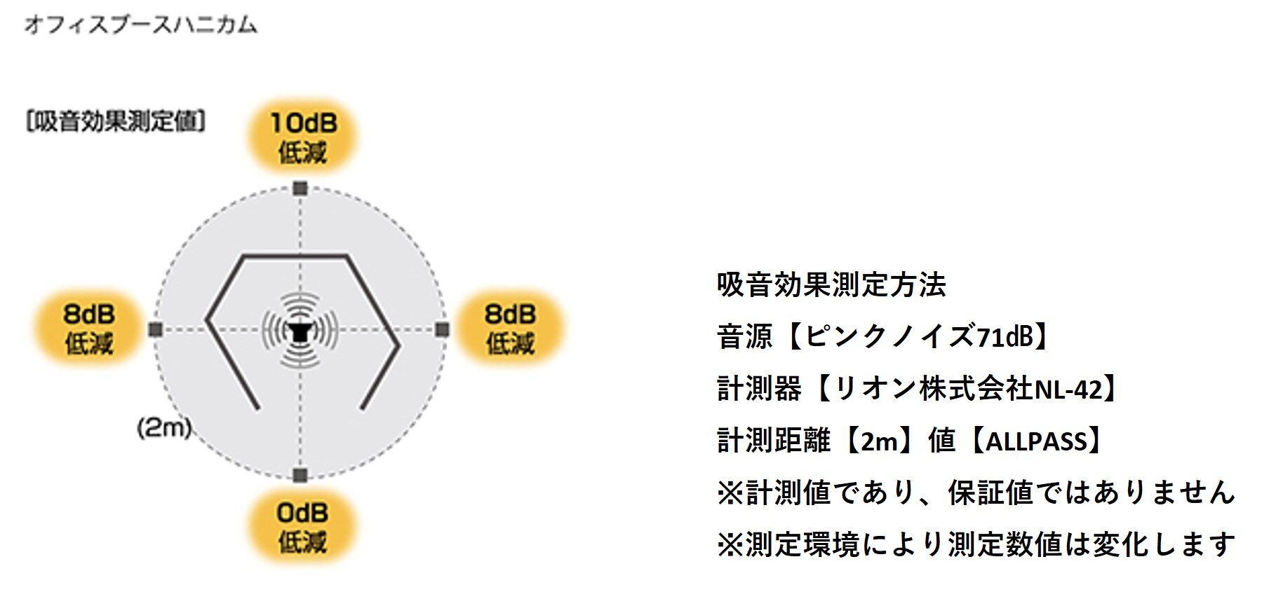 『REMUTE』に使用されている「テクセルSAINT」は、蜂の巣状のハニカム構造体と多孔質吸音材を積層化した最先端の吸音素材です。「中周波数帯域(中音域)」の吸音効果に優れ、中音域以上の広い音域で非常に高い吸音効果を発揮します。この「テクセルSAINT」を吸音パネルに用いることで、簡易ブースながら約10dB程度の吸音効果を得ることができます。![]()