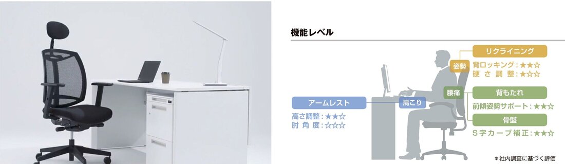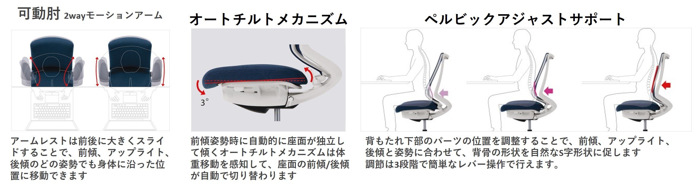 小柄な方から大柄な方まで様々な体格の方がそれぞれに合った設定機能が充実し、正しい姿勢を保つことをサポートできることが重要です。