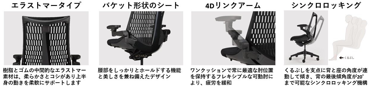 集中時もリフレッシュ時も、座る姿勢や身体の動きにフレキシブルに順応し、ワーカーを快適にサポートします。