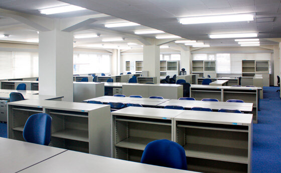 大規模な増築工事のため、人員も多く規模の大きい事務所づくりとなりました。工事現場が窓から見えるように、現場側には低い書庫を配置しました。執務デスクの島の間には、瞬時に打合せができるように打合せスペースを多く設けております。