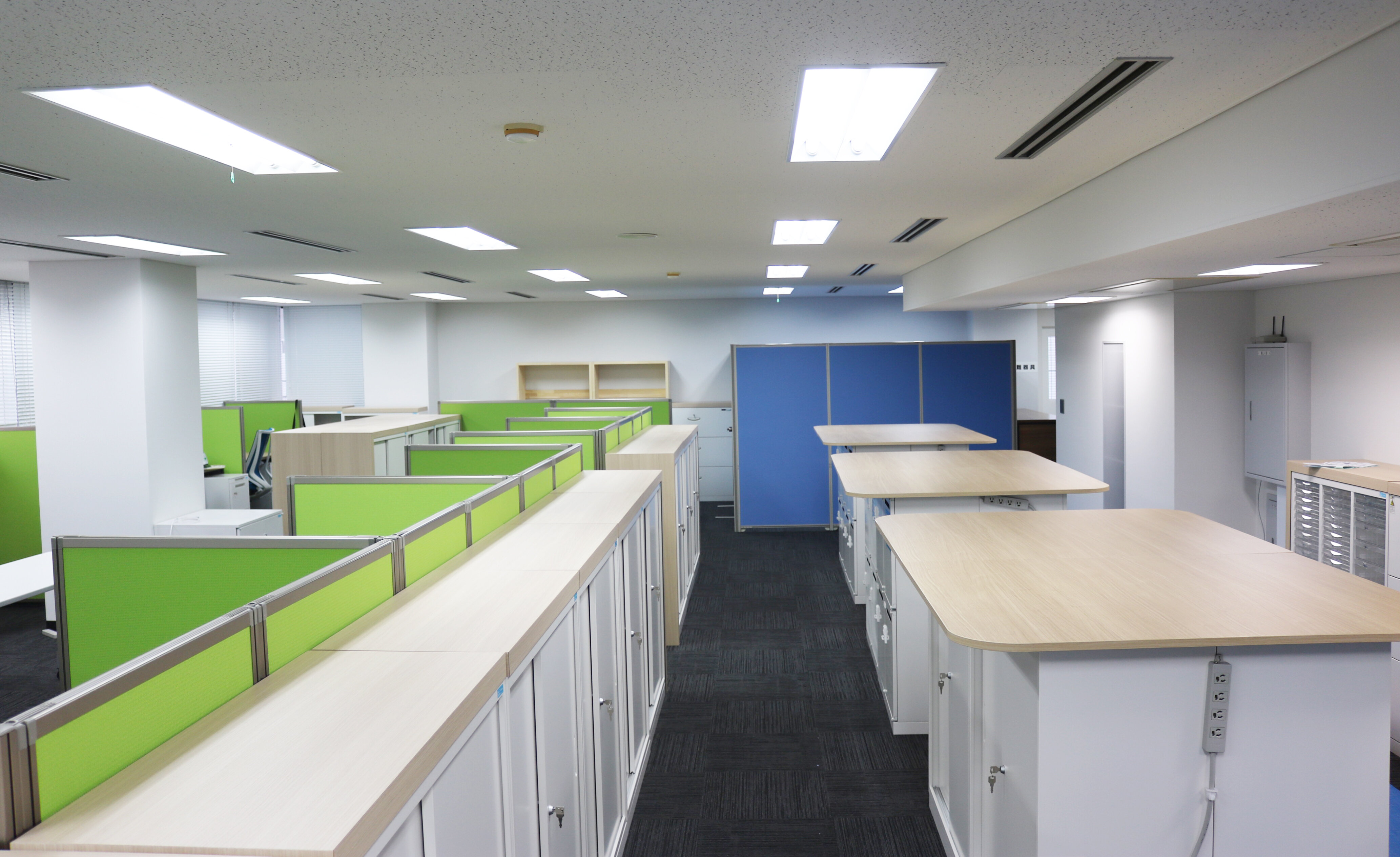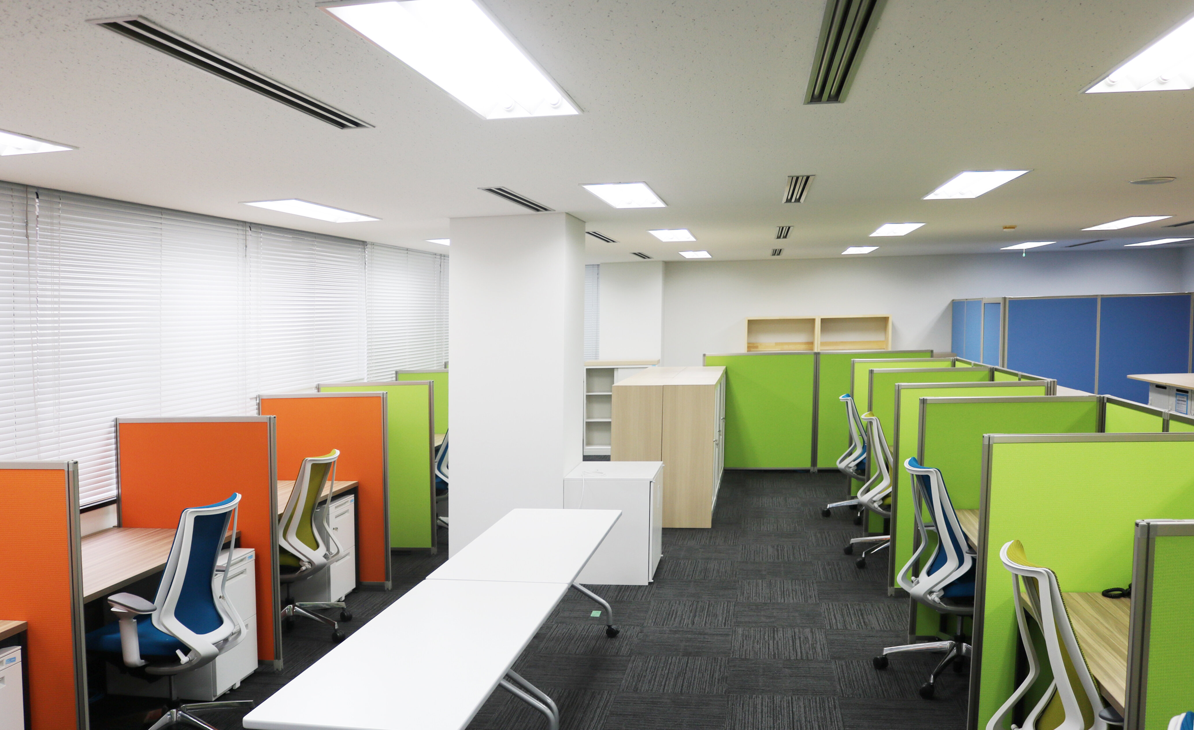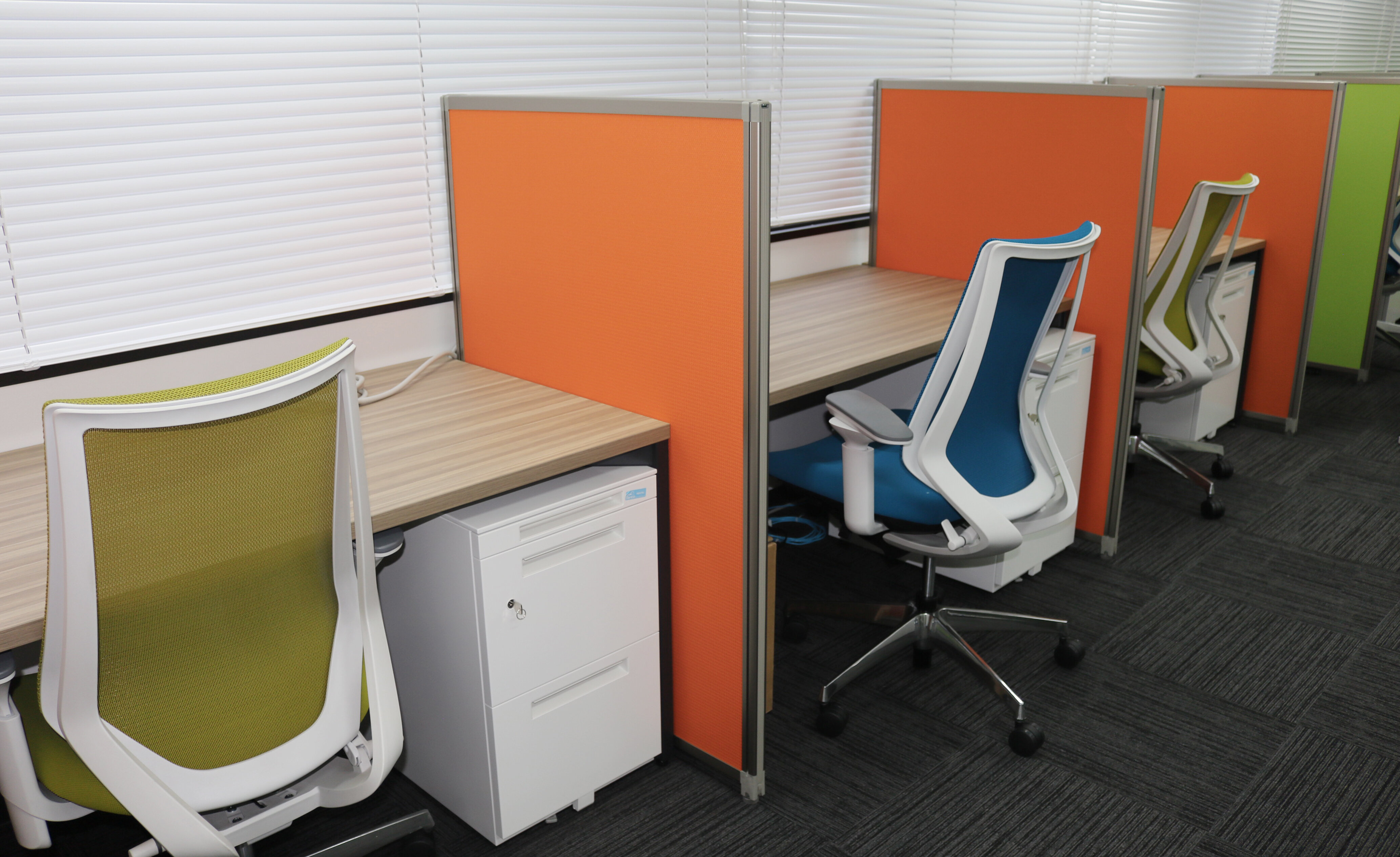 利用するパーティションにはお客様のコーポレートカラーを特注品で採用。 明るい色が目立って活気溢れる雰囲気の事務所に仕上がりました。
