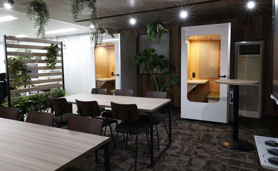 ミーティングエリア・高集中エリアは「New York style」をコンセプトにし、MAXHUBやHACO BOOTHで生産性の向上ができ、シーンに合った打ち合わせや執務が行えております。