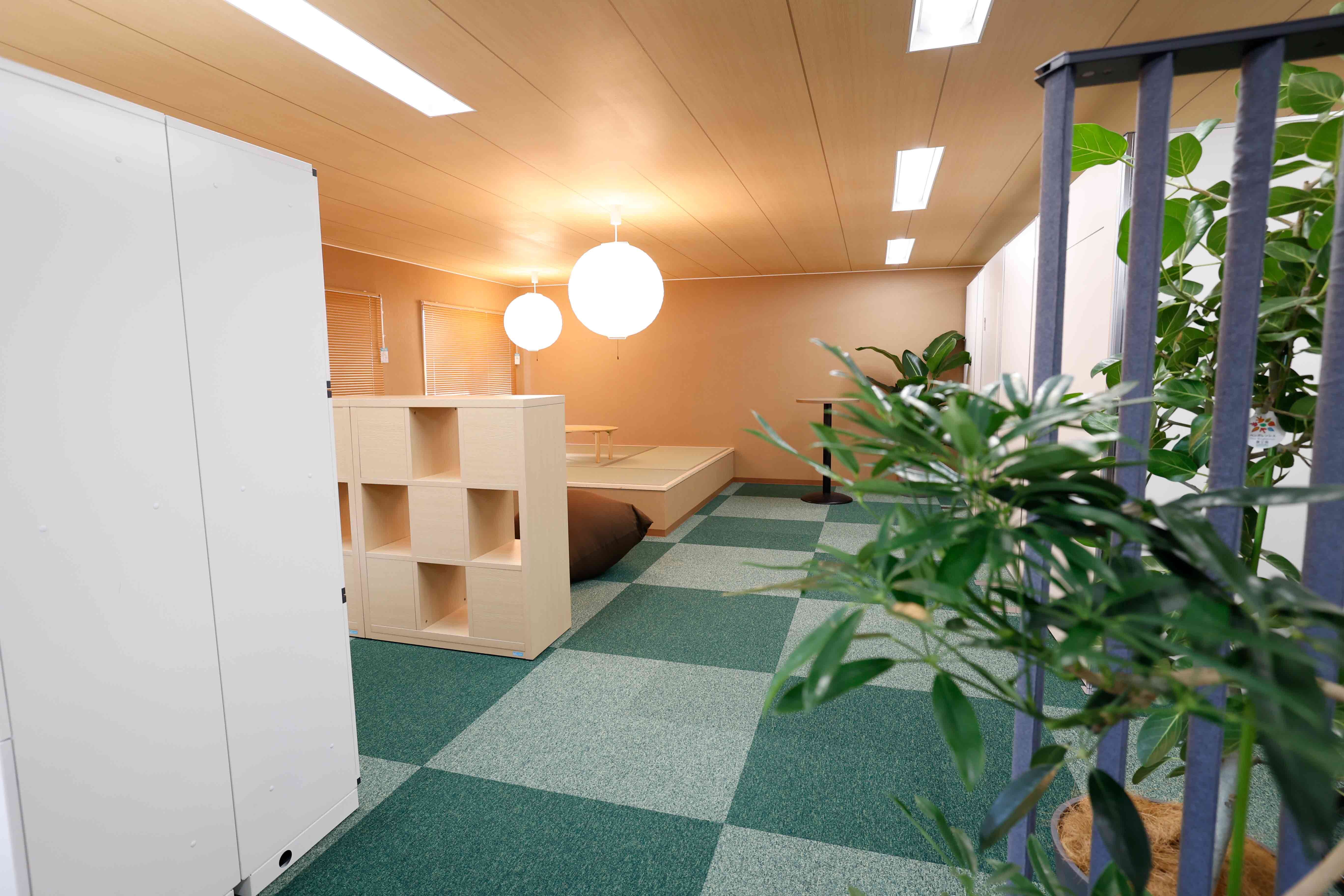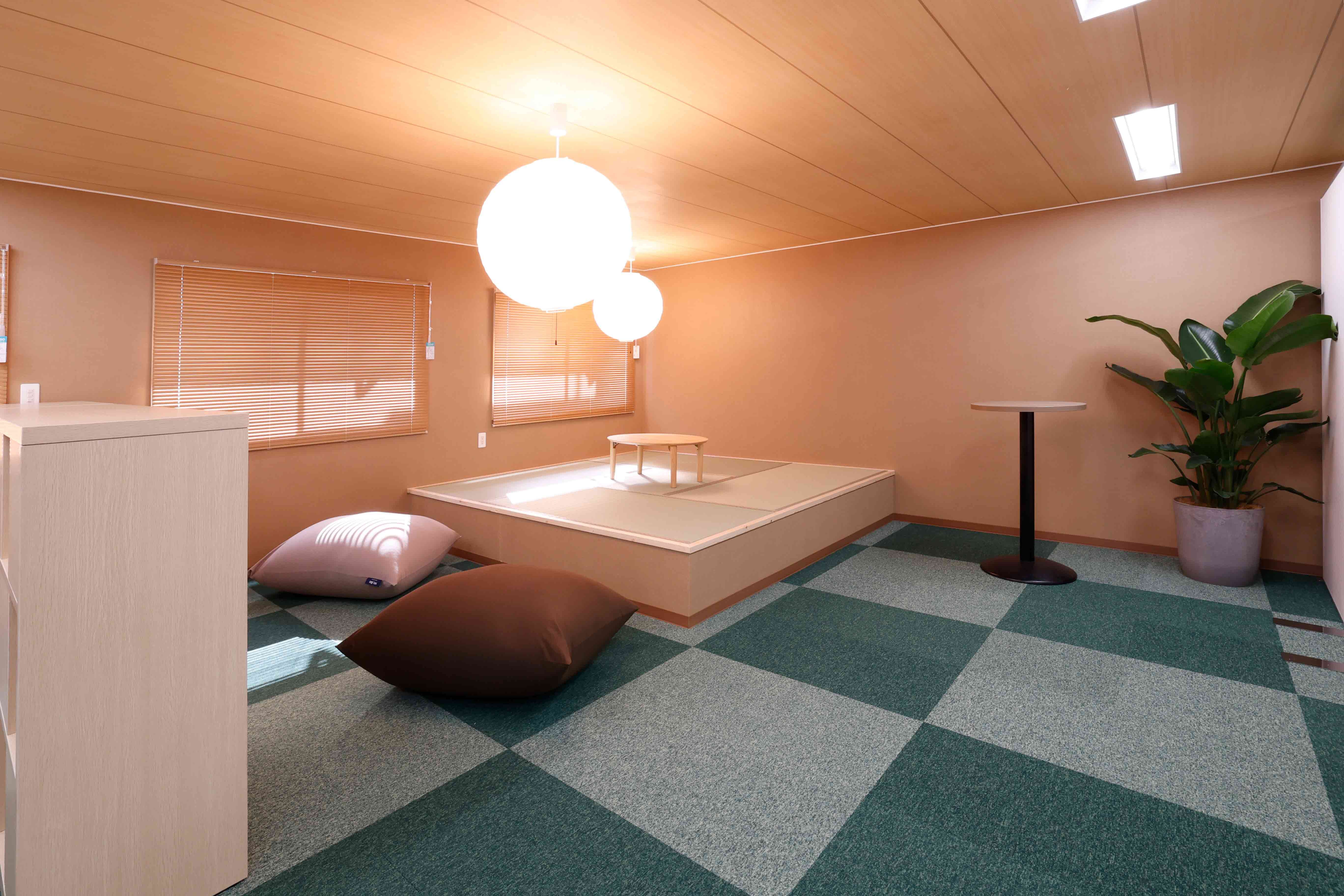 リフレッシュエリアは「Japanese style」をコンセプトとして畳の小上がりやハンギングチェア、ヨギボーでリラックスしたり、女性社員がお弁当を食べたりとそれぞれがリフレッシュできるスペースになっています。