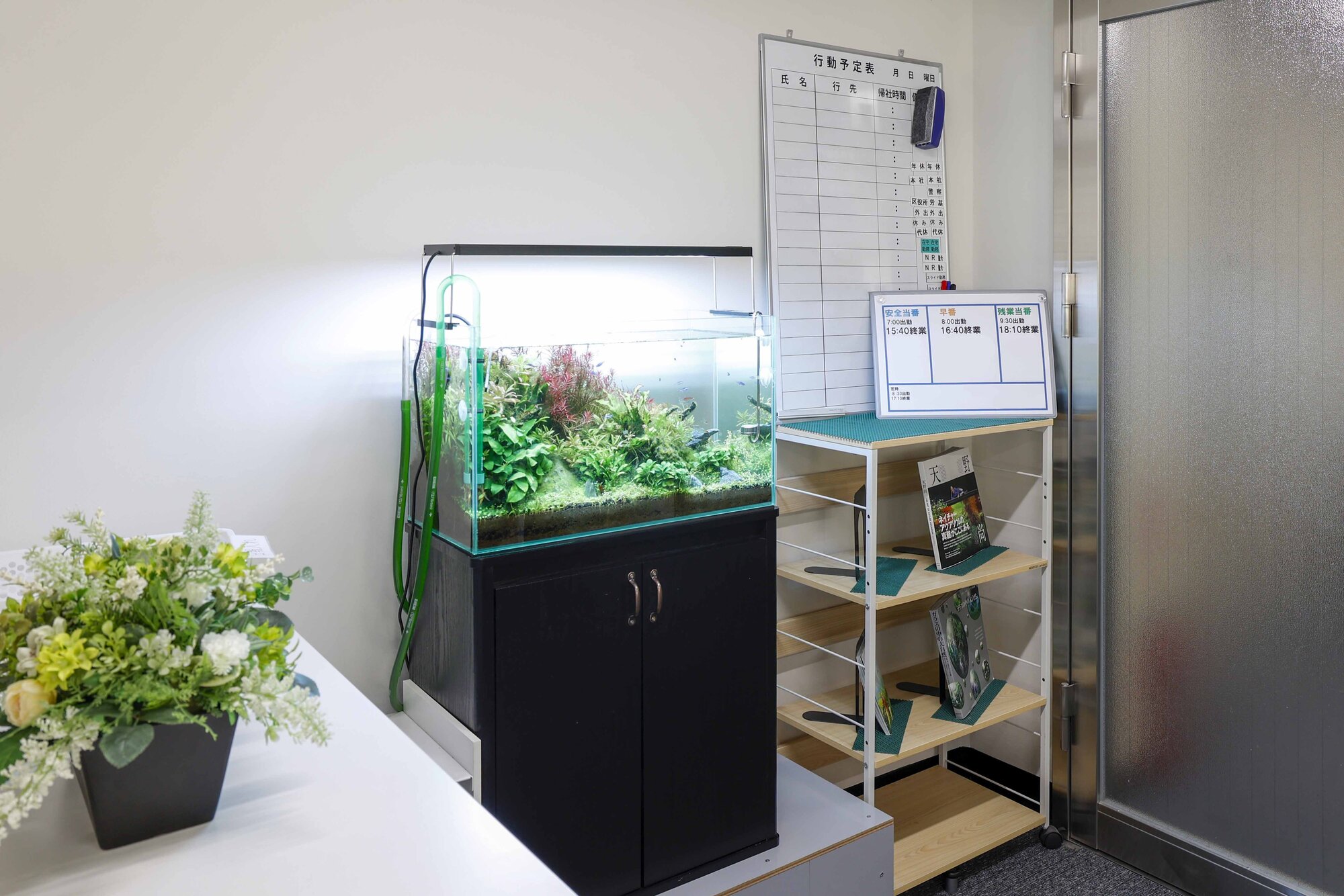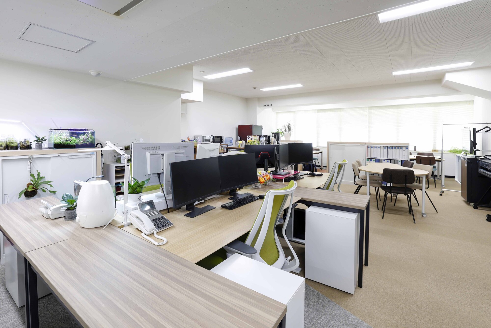 使用感としては、さまざまなバリエーションのテーブルを配置しているため、少人数から大人数まで、幅広い形式の打ち合わせが可能となり、コミュニケーションが活発になりました。また、各テーブルは臨時のワークスペースとしても利用できるため、社内の応援メンバーから社外の方まで、柔軟に働きやすいレイアウトになっています。さらに、リフレッシュスペースを設けることで、仕事にメリハリが生まれ、全体的なエンゲージメントの向上にもつながりました。植栽やアクアリウムと調和するデザインの家具が多く、緑と木を基調とした落ち着いた雰囲気の中で、リラックスして仕事ができる環境になっています。