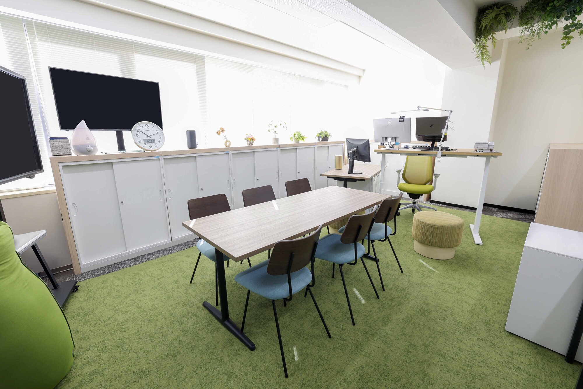 以前お取引のあったお客様から、新たに設立する事務所について、テナント選びを含めたご相談をいただきました。お客様はもともとデザイン性の高いオフィスに関心をお持ちだったため、移転にあわせて雰囲気を一新。光が溢れる明るく心地よい空間を実現しました。昇降式デスクを採用し、立ち作業・座り作業を自由に選べるようにすることで、長時間のデスクワークによる負担を軽減。さらに、ワーカーに合わせて最適な姿勢をサポートするハイグレードチェアを導入し、快適な座り心地を提供しました。リフレッシュスペースも設けることで、適度に休憩を取りながら働ける環境を整え、作業効率やチームワークの向上にも貢献しています。弊社で什器備品を提案した後、お客様自らデスク周りや天井にグリーンをデザイン。視覚的な癒しを与えるとともに、ストレス軽減や集中力向上を促進しました。こうしてワーカーの快適性がさらに向上したことで、より生産性の高いワークスペースが実現しています。
