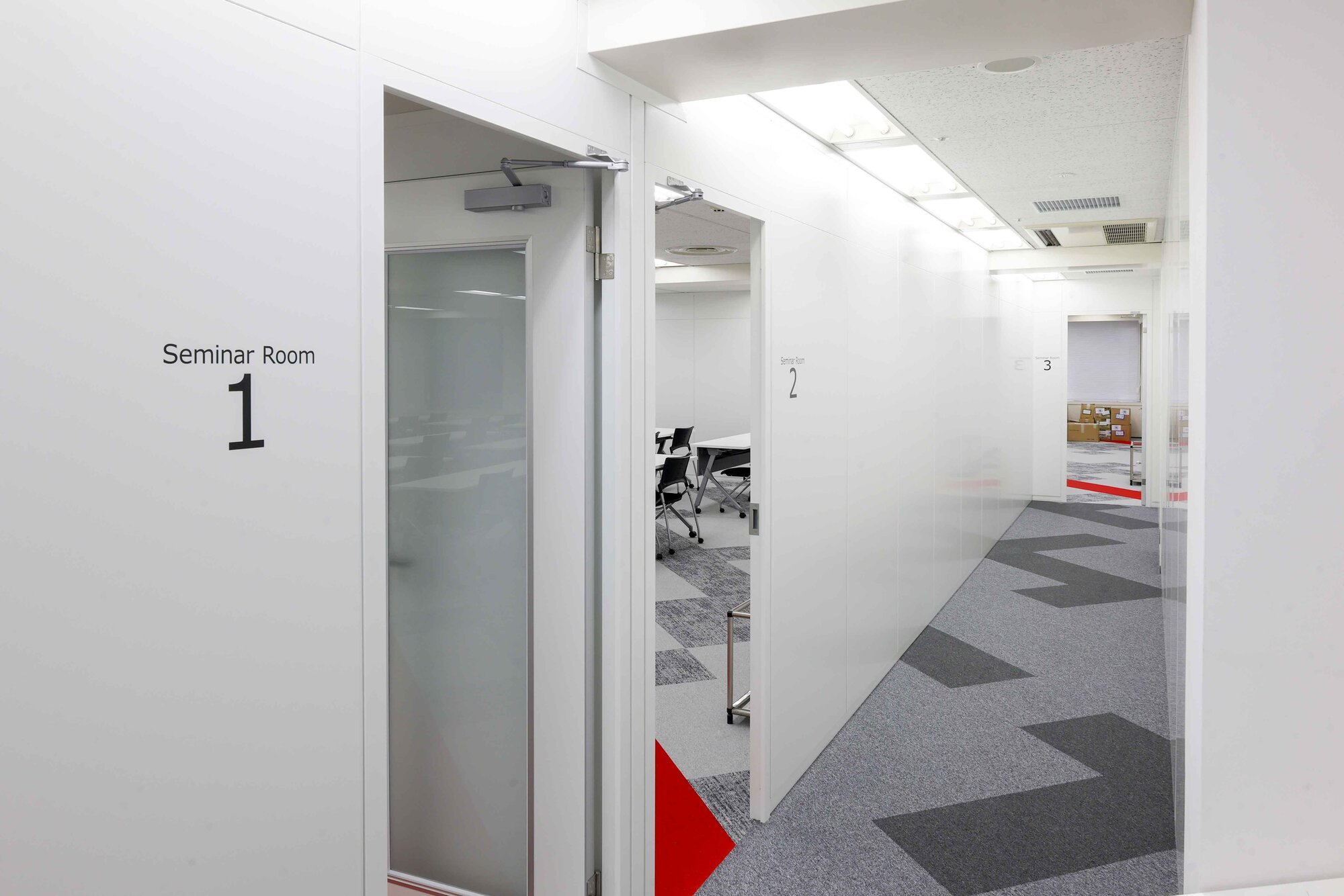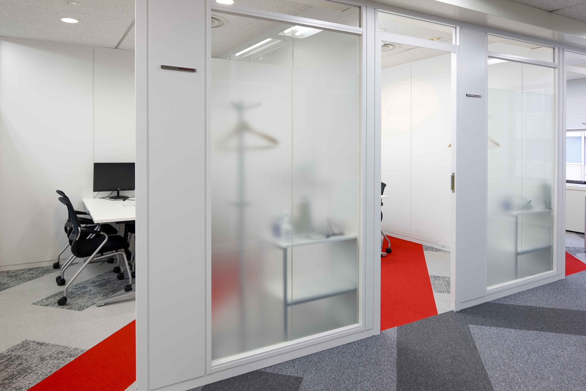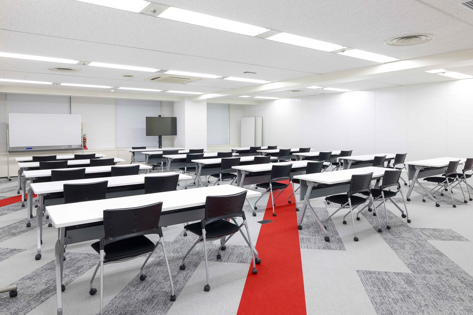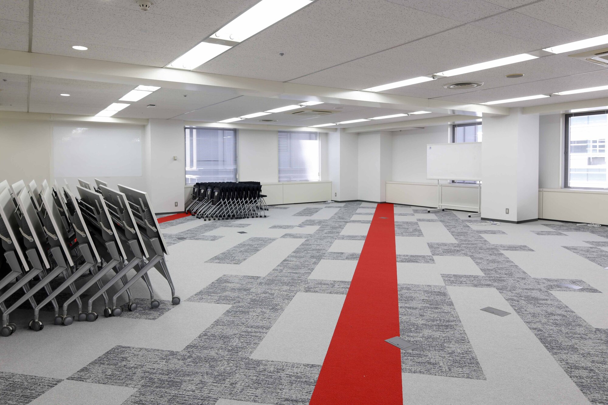 執務スペースをセミナールームにリニューアルしたいとのご相談をいただき、当社サービス「DoReMo(※1)」をご提案し、デスクなど不要家具の廃棄から内装工事、新たな家具のご提供まで、ワンストップで対応いたしました。内装面では、赤いラインをアクセントにした床デザインや、廊下と会議室で異なる配色を採用するなど、細部までこだわった空間づくりを実現。さらに、間仕切りを造作し、機能的なオフィスレイアウトを実現しました。納品する家具にはコストを抑えつつ高品質な中古品を採用し、比較的安価にリニューアルを実現。不要となった家具の買取・廃棄も含め、移設から施工、納品までを当社が一括対応することで、お手軽で効率的なオフィスづくりをサポートいたします。