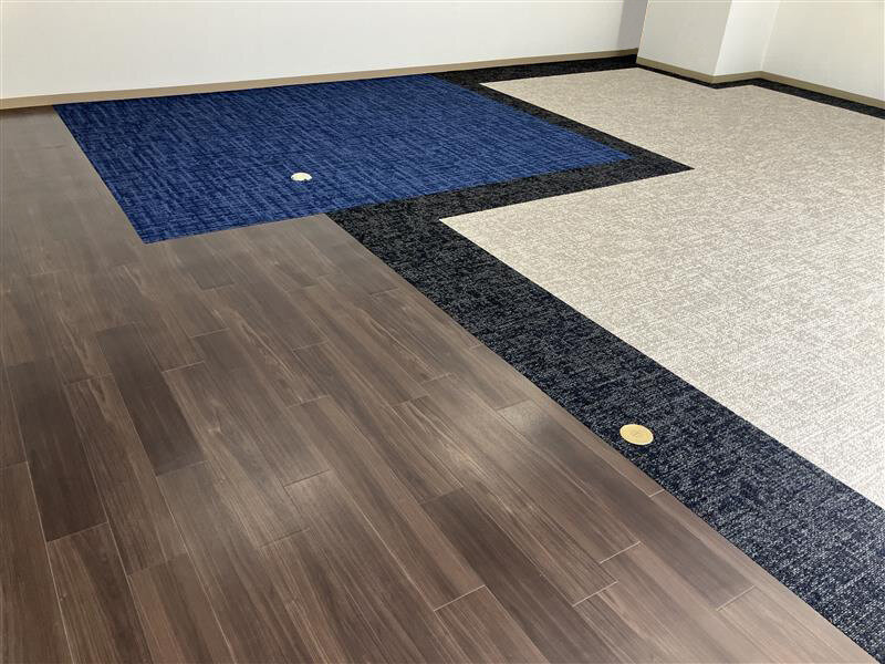 タイルカーペットは空間の用途ごとに張り分けを行い、ゾーニングを明確にしました。エントランス部分には木目調のタイルを使用し、来客を迎えるにふさわしい落ち着いた雰囲気を演出。執務スペースや会議室エリアには、それぞれにデザイン性のある貼り分けを施し、機能性と美観の両立を図っています。