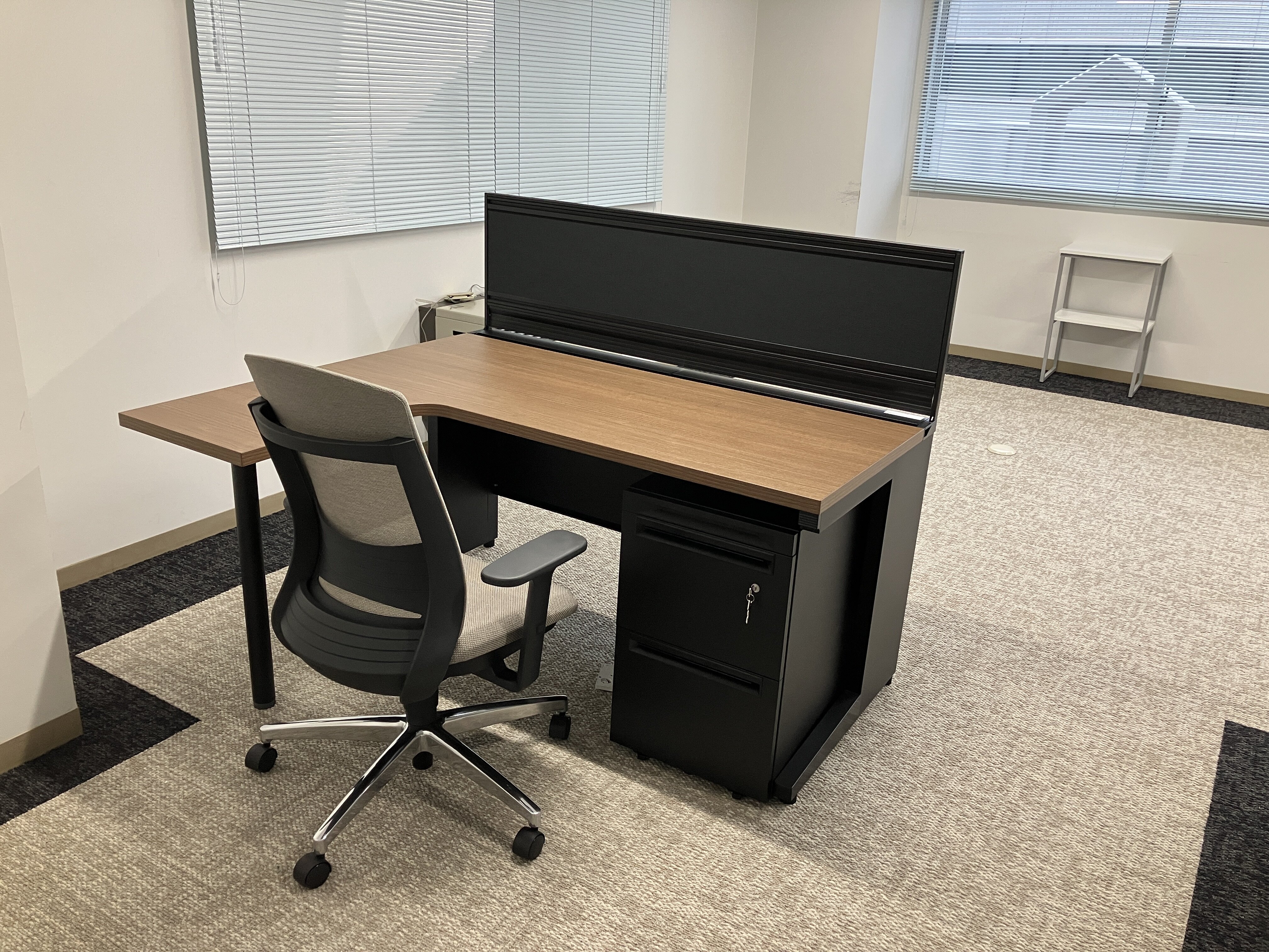 家具は、脚部をブラックカラーで引き締めつつ、天板は温かみのある木目調を採用することで、スタイリッシュでありながらも親しみやすい雰囲気に仕上げています。
