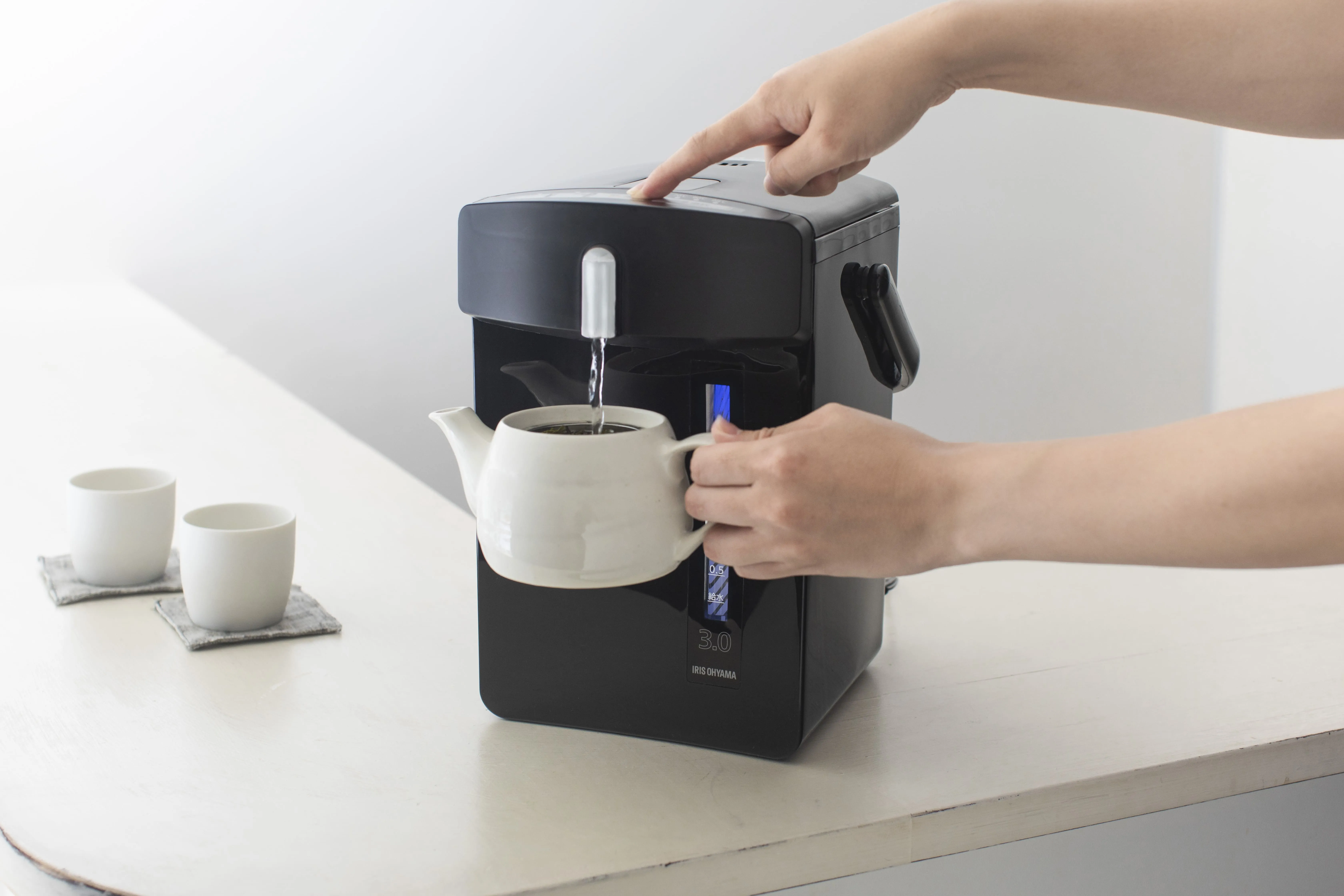 角型を基調としたスタイリッシュな電気ポットです。丸型デザインよりスリムでコンパクトに見え、オフィスになじむデザインです。保温温度を3段階の設定できるため、複数のシーンで使用可能です。