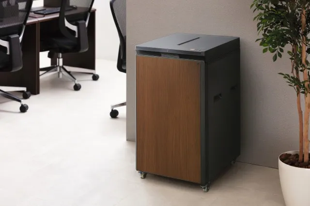 オートフィード(自動送り)機能が付いているため、書類の束をセットしてスイッチを押すだけで自動細断します。くずならしアームがダストボックスにたまった細断くずをならすため、手でならす手間が省けます。暗証番号の入力でトップカバーにロックができるので、セキュリティも万全。遠くからでも細断状況がわかりやすいカラーLEDランプ付きです。