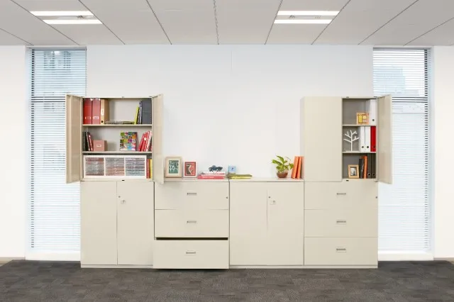 両開き戸になっており、収納物の出し入れがしやすく、施錠可能な扉が付いていることで、中身が丸見えにならず、セキュリティ的にも安心です。