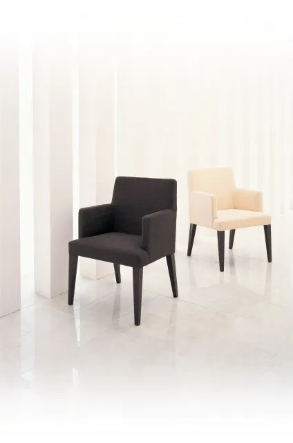 シンプルかつ高級感のあるデザインのチェア。 ベージュとウェンゲの色合いや肘付きの重厚感は、高級感を演出したいときにピッタリです。