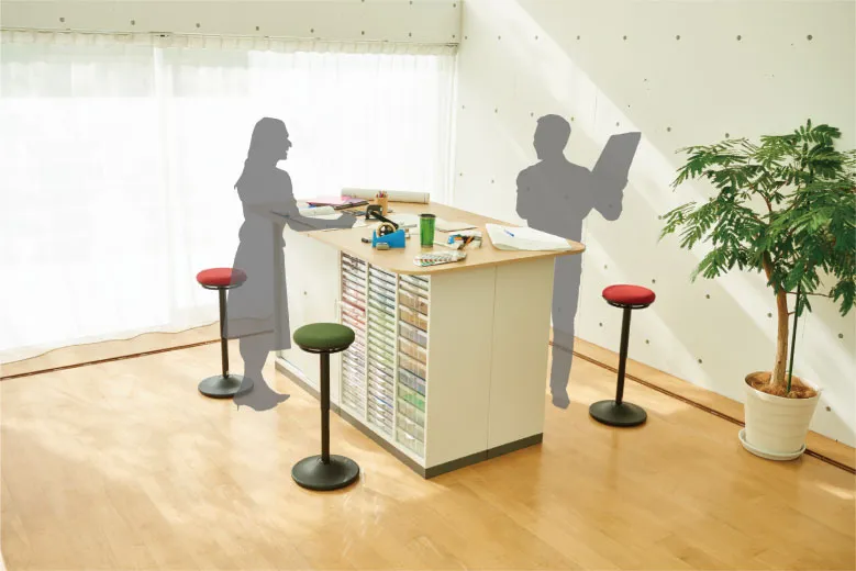 ハイテーブルや昇降テーブルと組み合わせる事で、立ちミーティング時にも活用する事ができ、健康増進オフィスに一役買うこともできます。