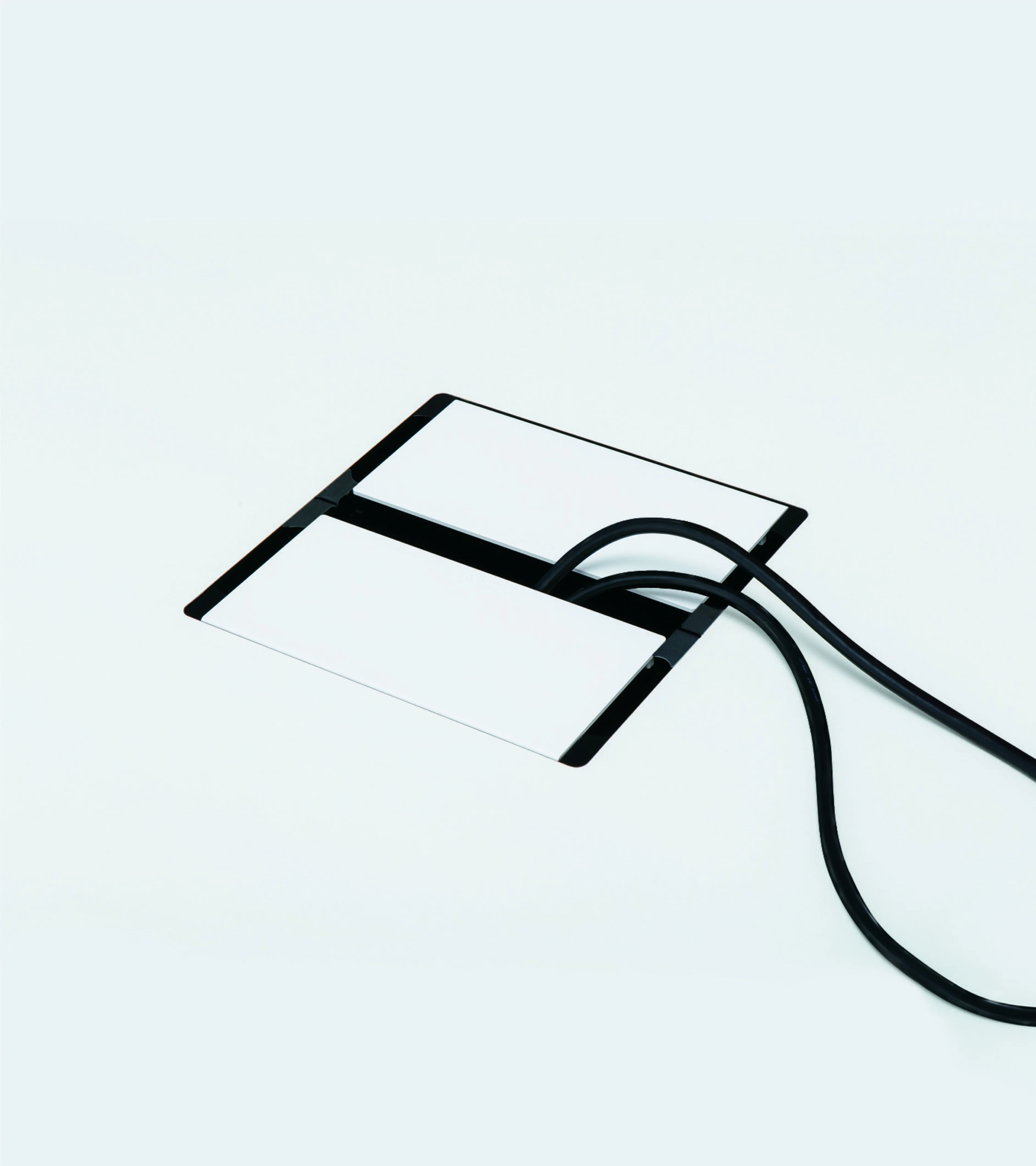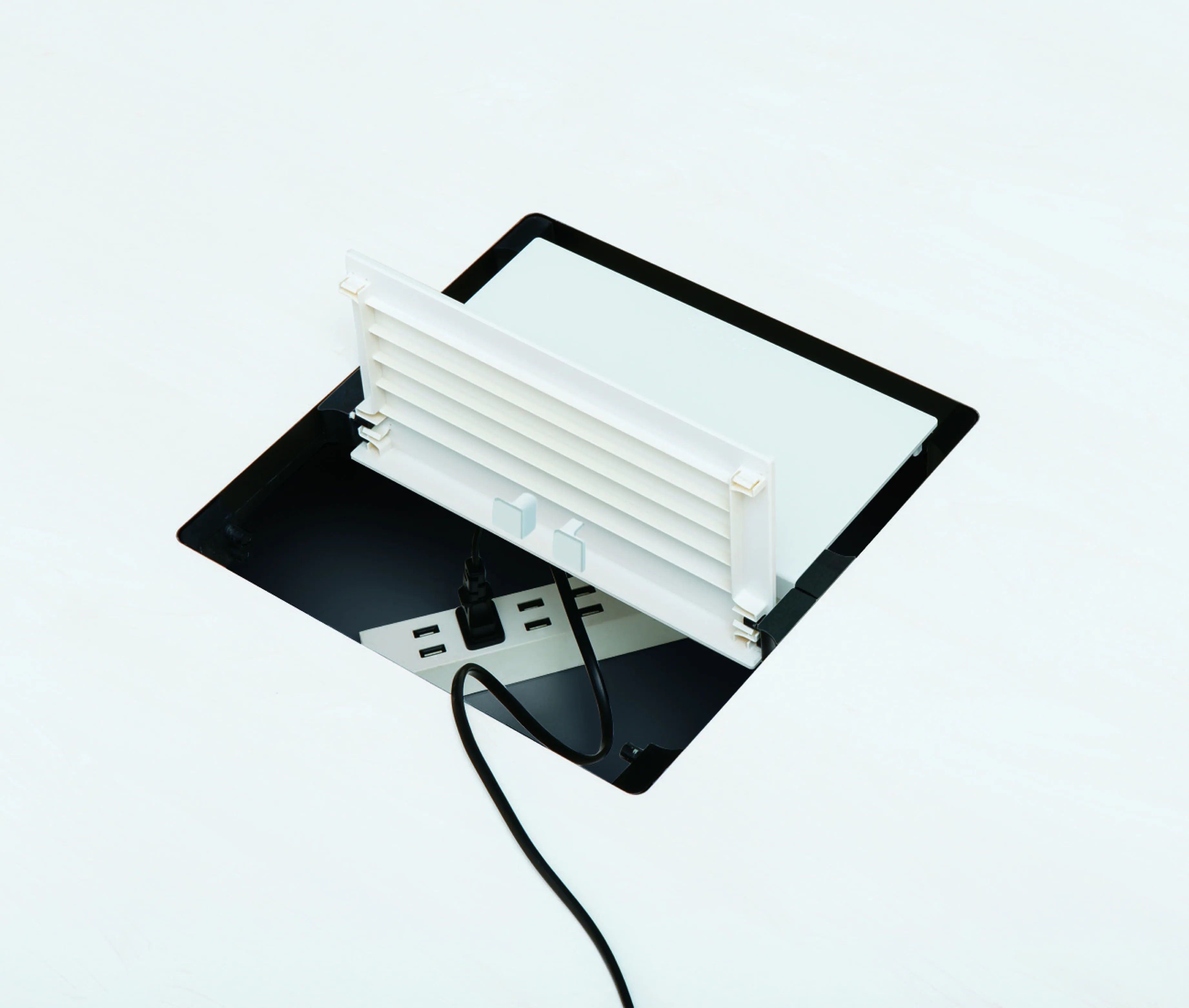 材質:天板/メラミン化粧板、エッジ/ABS樹脂、配線取出口/樹脂成型品+アルミダイキャスト塗装仕上、配線ダクト/スチール塗装