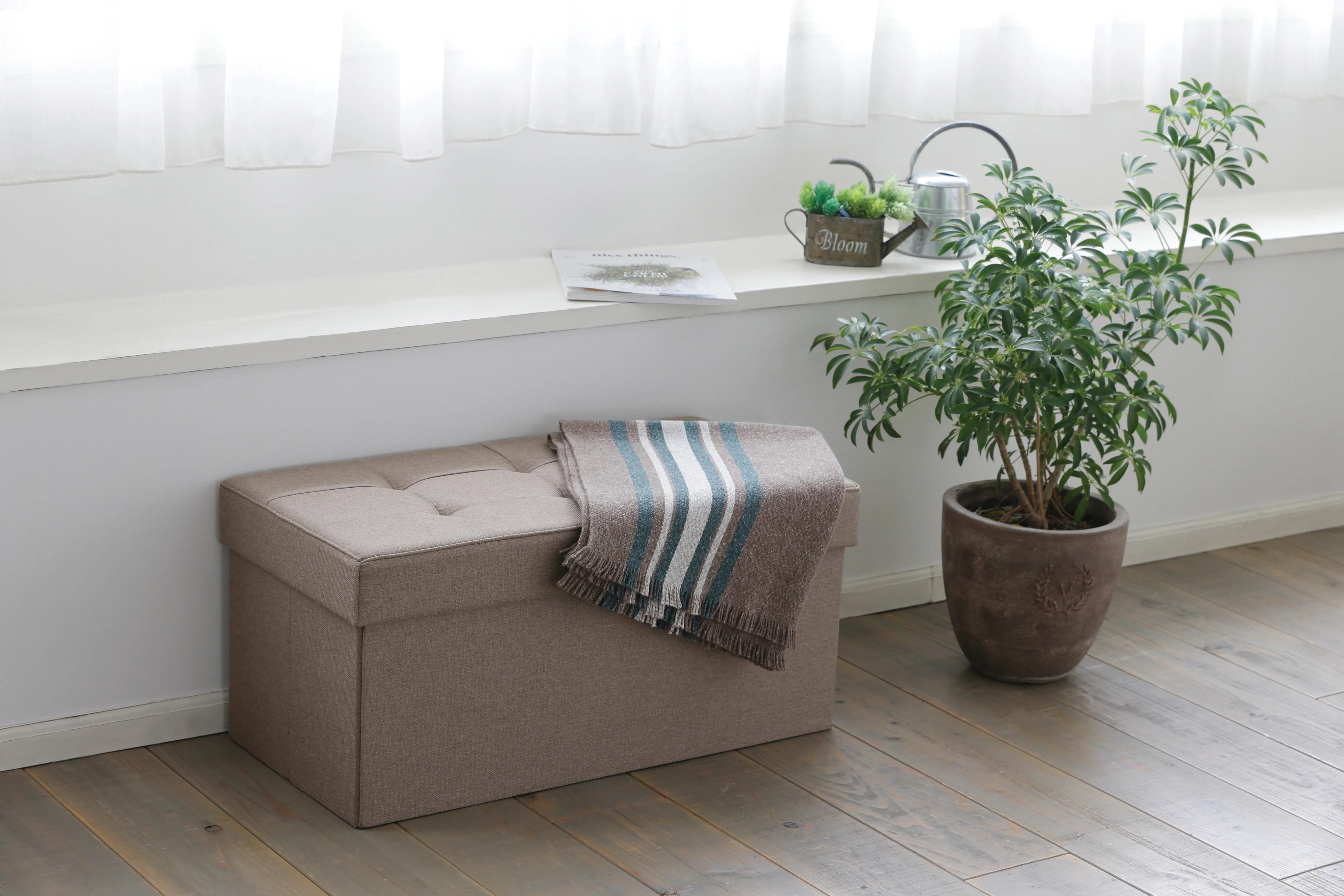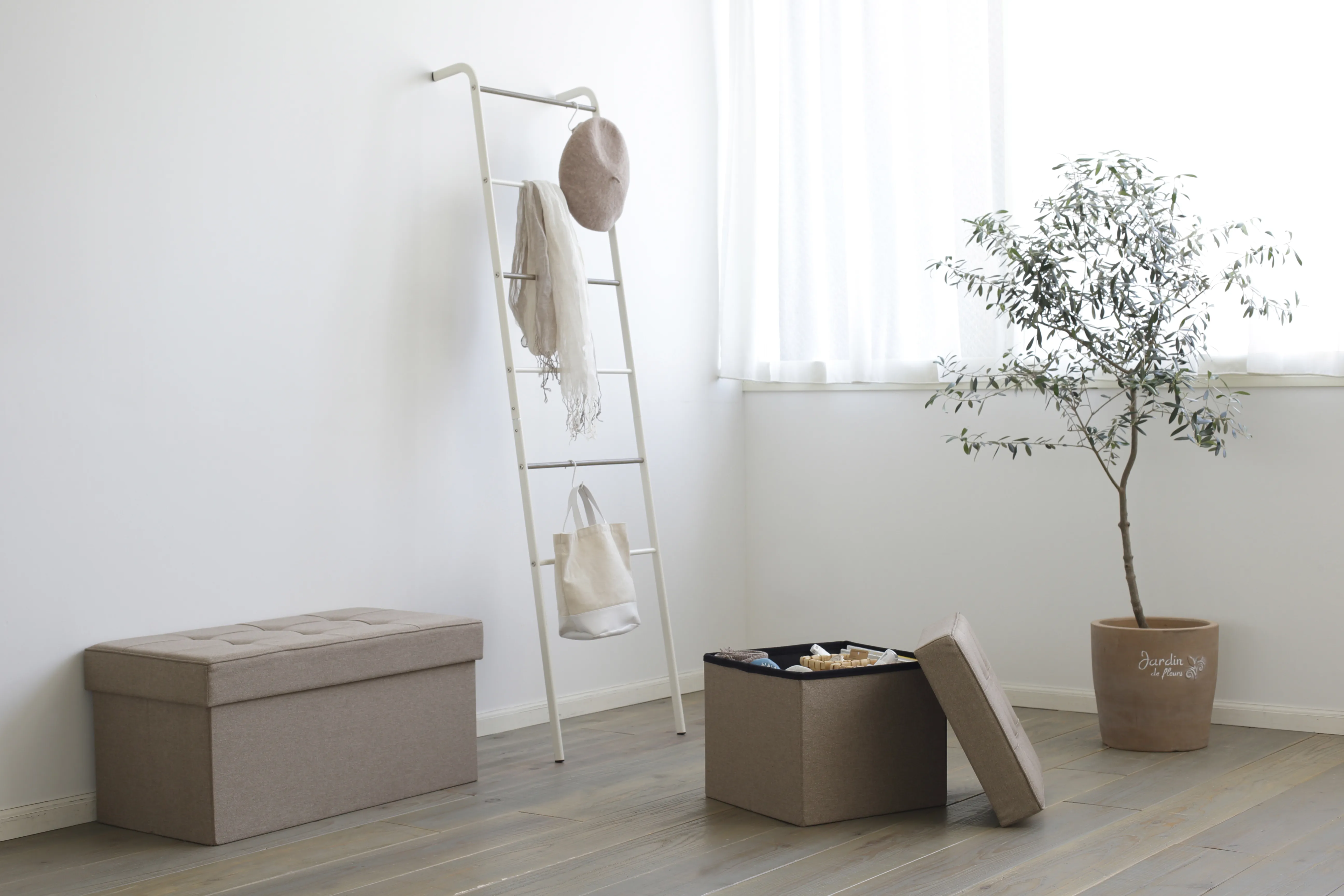 座る、小物収納、オットマンとしても使える 多機能折りたたみスツール。 使用しない時は、コンパクトに折りたたむことが可能です。