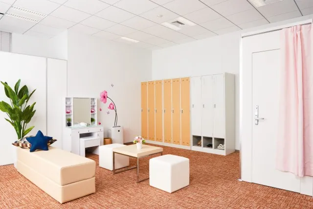 ロッカー扉にアクセントのある木目調シートを採用。 更衣室の雰囲気を変え、明るい空間を演出します。