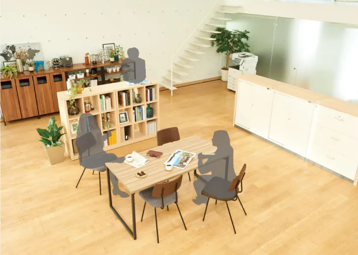 いろいろな場所から人が集まるので、部署の垣根を越えた社内コミュニケーションも活発になり、資料を見ながら自然と会話とアイデアが生まれます。