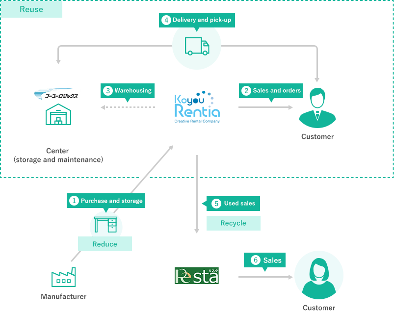 The rental business can contribute to the realization of a recycling-oriented society by repeatedly using limited resources. On the other hand, CO2 emissions during logistics increase (the backfire effect). The Rentia Group is promoting decarbonization during delivery in order to reduce the backfire effect, which is an issue in the supply chain of the rental business. We will continue to fulfill our corporate social responsibility through pioneering initiatives in the rental industry.