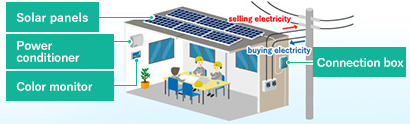 This system, the most common type, lets you use electricity generated by solar power during the day and electricity from a power company at night or when solar power generation is low. If the amount of power generated exceeds the amount of power consumed, the surplus* can be sold to a power company.