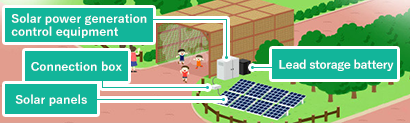 This system generates electricity and is not connected to the electric wires of a power company. Electricity generated by the solar panels is stored in a battery and used when needed. The system can be used where there are no commercial power sources. While electricity can neither be bought nor sold, installation is easy and doesn't require consultation with a power company.