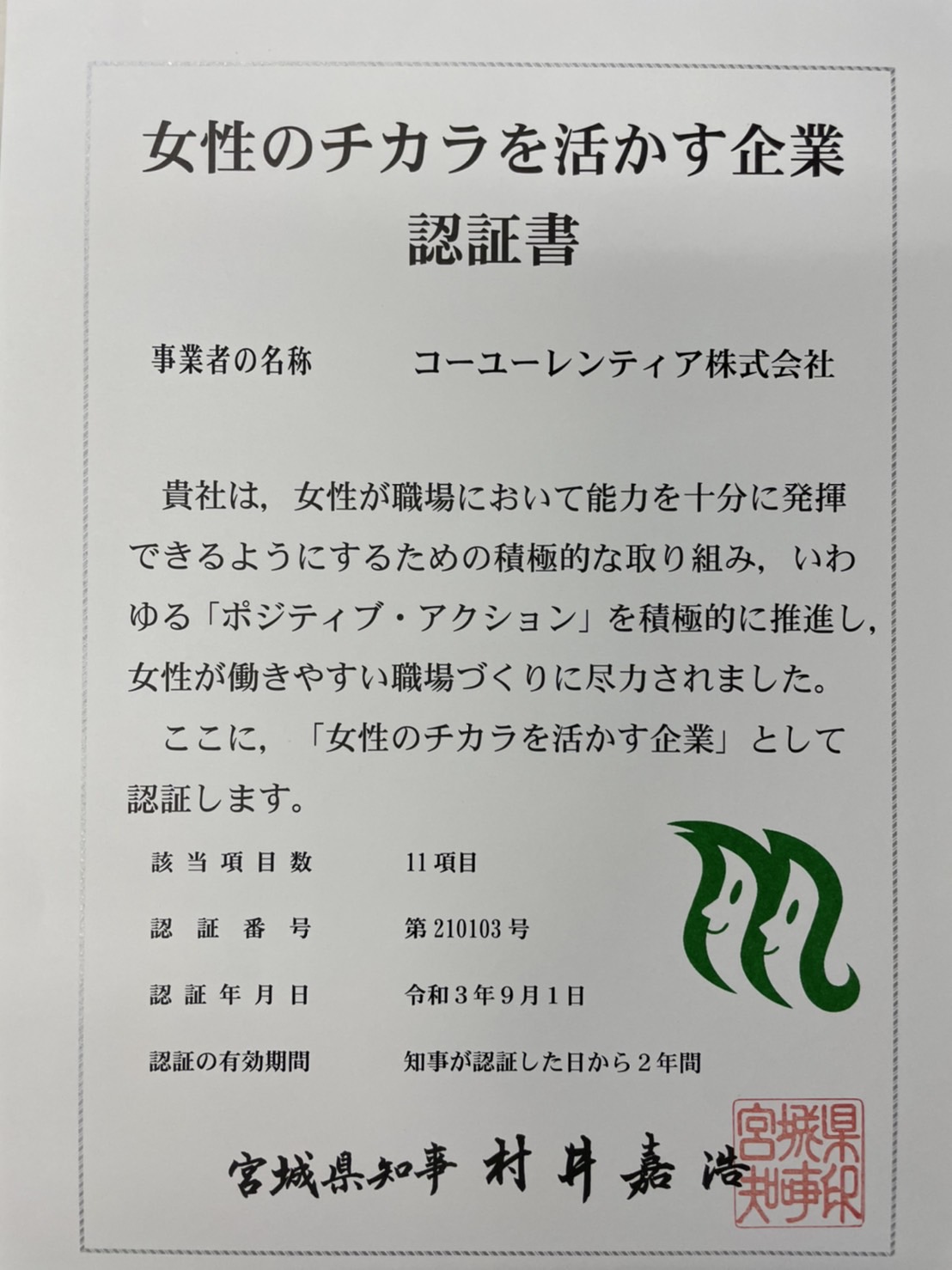 コーユーレンティアは、宮城県が推進する「女性のチカラを活かす企業」に認定されました。