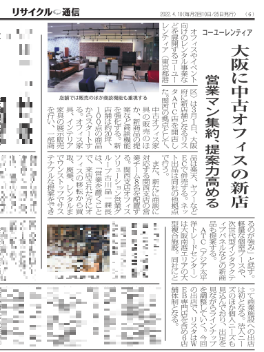 4月10日発行のリサイクル通信に当社記事が掲載されました。 同紙は中古・リユースビジネスを扱う専門新聞です。関西支店オフィスソリューション営業グループの移転とリユースショップ「リスタATC」の新規開設について取材を受け、その内容が紹介されております。是非、ご一読ください。